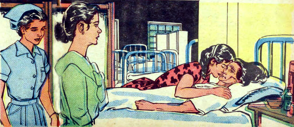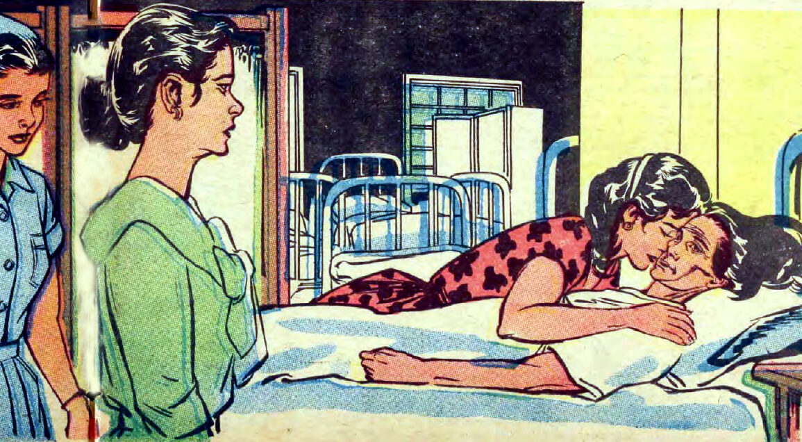 Yaon ay hinalinhan ng ibang larawan sa isip ni Ofelia: ang unang pagdating niya sa pagamutan. Kasama niya noon si Donya Adela. Ito ang nagpakilala sa kanya sa isang babaing bagama’t ayon sa tuos ni Donya Adela ay may mahigit lamang apatnapung taong gulang ay mukhang matandang-matanda na dahil sa taglay na sakit. Buto’t balat na lamang ang babae. Ang sakit ay kanser sa bituka. Iyon ang kanyang ina. Na sa isang silid na walang bayad sapagka’t mahigpit na tumanggi nang sabihin ni Donya Adela na ililipat sa isang may bayad na silid.
