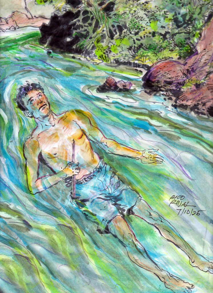Tuwang-tuwa siyang tumatampisaw sa mababaw at mabatong bahagi ng ilog na kung minsa’y hindi maipaliwanag sapagkat lumiliit at lumalaki itong parang may sariling buhay at kamatayan.