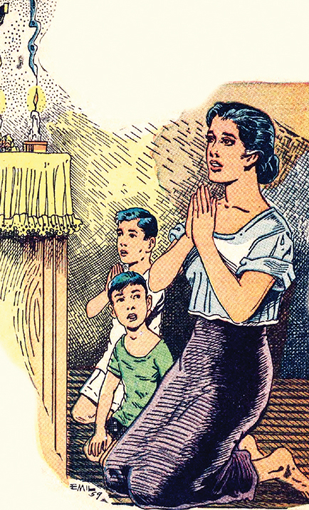 TAHIMIK at walang patid ang pagluha ng dalawang maiikling kandilang tumatanglaw sa munting dalanginan. Hindi kumikilos, hindi man lamang humihilig ang ningas ng tapat na kandilang ang inihahandog na ginintuang liwanag sa nakatirik na pagpapasakit ay gumagawa pa ng isang nakadipang anino sa dinding na sasag.