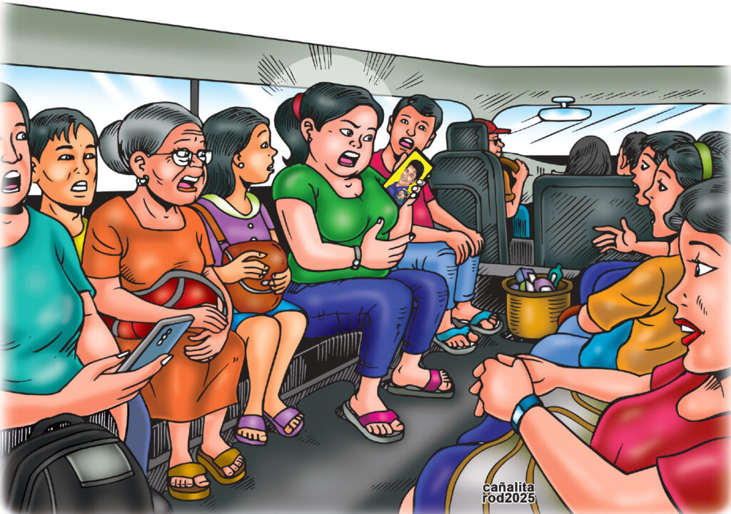 Iyong telepono niya, ayaw ko mang tingnan, di puwede. Halos nakaduldol iyon sa akin. Kapag tumagilid ako ng upo para iwasang makita iyon, malalaglag ako o iyong mga dala ko. Maaasar din sa akin ang senior na aleng katabi ko. Baka akalain pang magpapa-picture ako kaya ako nag-side view.